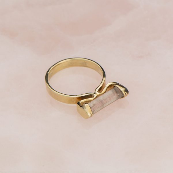 Een sierlijk bamboe blad omwikkeld je vinger. Zoals ze van nature is met een roze kevertje die wandeld over de ring. Hier is gekozen voor toermalijn omdat ze prachtig van kleur is.